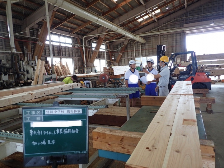 まずは、木造住宅の骨組みになる“構造材”のプレカット工場へ☆継手の加工を施して現場で実際に組み立てるイメージをして頂きました(^^♪